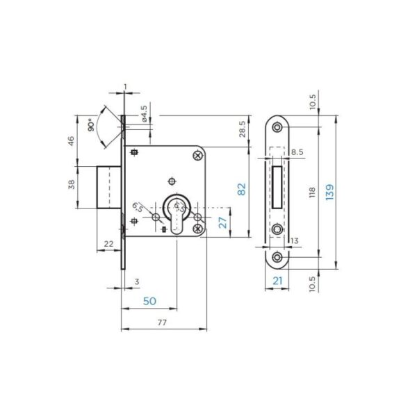 Ključavnica za lesena vrata težka do 60 kg, univerzalna – leva in desna, dvojni zaklep, ohišje je zaščiteno proti koroziji.