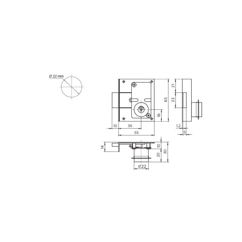 Ključavnica za pohištvo, cilinder fi 22 mm, v kompletu 2 ključa, cilinder in rozeta.